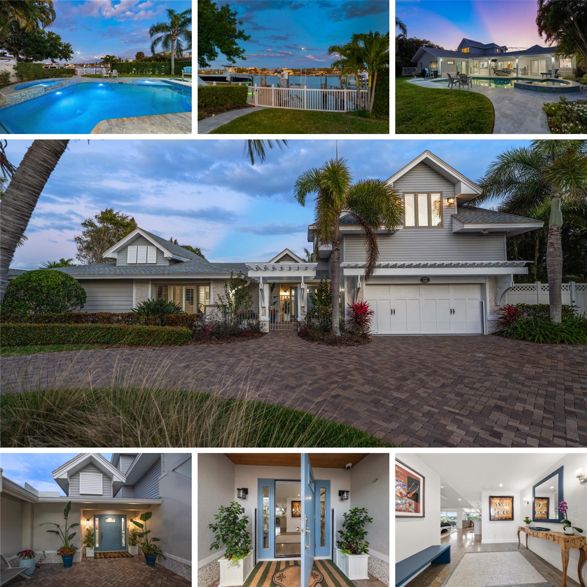 Perfectly poised in the highly sought-after Harbor Bluffs, this stunning move-in ready waterfront residence offers the ultimate blend of luxury, comfort, and effortless Florida living. From the moment you arrive, the pavered circular driveway and welcoming courtyard create unforgettable curb appeal, setting the tone for the designer finishes found throughout. Inside, limestone floors flow through an open, light-filled interior where a striking family room with a beamed ceiling and a dramatic wall of sliders seamlessly connects indoor and outdoor living. Step outside to your backyard oasis—fully fenced for privacy—where a beautifully refinished pool with elegant marble pavers and a spillover spa create a true resort-style setting. Designed for unforgettable entertaining, this outdoor retreat offers expansive lounging areas and seamless access from multiple rooms of the home. Double doors reveal a versatile flex room—ideal as a home gym, craft studio, or additional bedroom—with a full bath conveniently nearby. The showstopping dine-in kitchen is a chef’s dream, featuring quartz countertops, a six-burner gas range, double ovens, a Bosch dishwasher, pantry, oversized island with prep sink, and a breakfast bar illuminated by elegant pendant lighting. A stylish dry bar with wine fridge and abundant storage, along with a charming coffee bar for relaxed poolside mornings, elevate everyday living. Sliders off the dining area open directly to the pool, enhancing the home’s seamless flow, while a dedicated office provides quiet productivity. The exquisite primary suite is a serene retreat filled with natural light and private pool access. Its spa-inspired ensuite boasts dual vanities, custom tilework, a jetted tub, walk-in shower, and an extraordinary custom walk-in closet with built-ins and center island. Each additional bedroom is spacious and well-appointed with its own ensuite bath. Upstairs, a flexible bonus space—currently a billiard room—offers a full bath and kitchenette with beverage area, refrigerator, and disposal, making it ideal for guests or multigenerational living. For boating enthusiasts, this property is a true paradise, set on protected water and complete with a 14,000-pound boat lift that accommodates a 24–26 ft boat, providing quick access to open water and endless days cruising the Intracoastal. With a whole-house generator, tankless water heater, flood barriers for every opening, a newer roof, and a quiet location close to dining, shopping, and the area’s beautiful beaches, this exceptional waterfront home truly has it all.